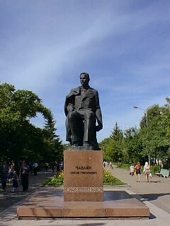 The statue of Shketan stands in a garden beside the Mari theater on Leninsky Prospekt, which is the main street of Yoshkar-Ola today. The statue of Chavajn stands in the middle of Chavajn Boulevard.